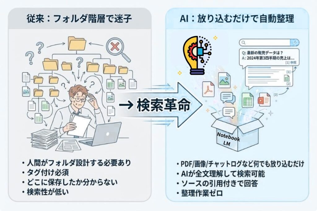 そう思われるかもしれません。しかし、Googleの無料ツール「NotebookLM」などを活用すれば、過去の資料やメモを「整理せずにただ放り込むだけ」で、高精度な検索システムを構築することが可能になっています。