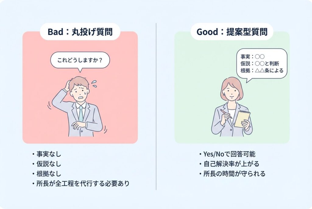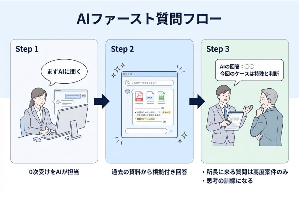 所長にとっても、「調べるだけの単純な質問」が消え、「判断が必要な高度な相談」だけが上がってくるようになるため、業務の質と育成スピードが同時に向上します。