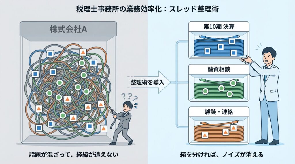 多くの事務所で陥りがちなのが、「顧客ごと(人ごと)」にスレッドを作ってしまうパターンです。
