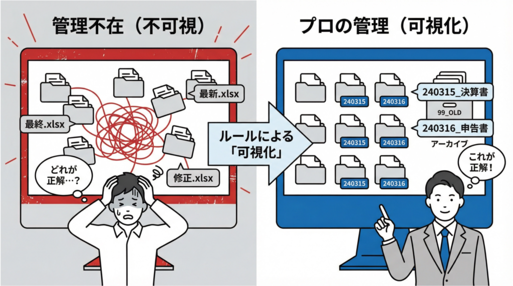 もし、「担当者に聞かないと最新版が分からない」「フォルダの中に『最新』『修正』『最終』というファイルが混在している」という状態なら、それはDXではなく「管理不在」の状態です。