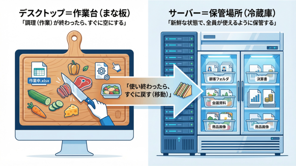 料理で例えるなら、デスクトップは「まな板(作業台)」であり、サーバーは「冷蔵庫(保管場所)」です。