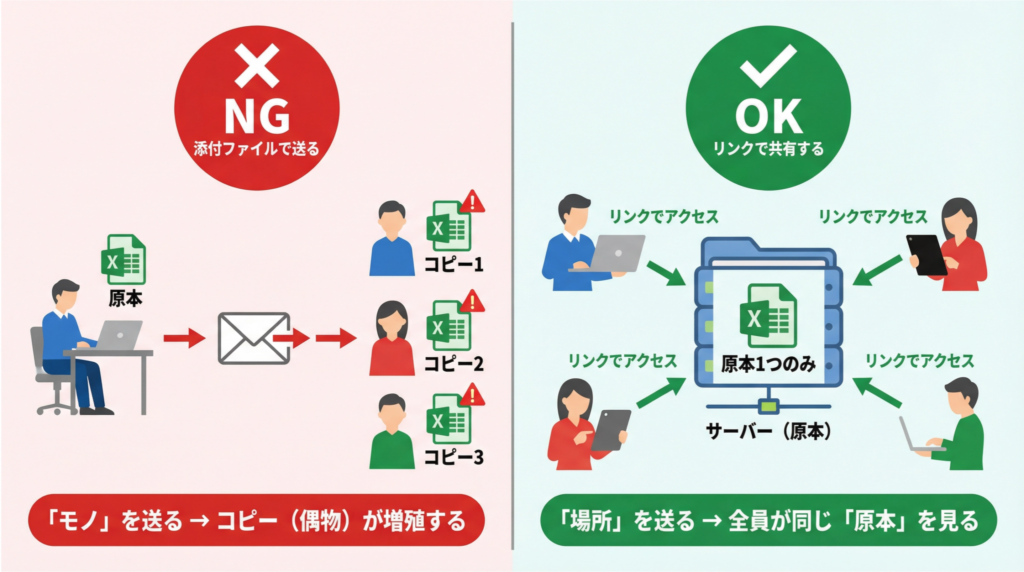 答えはシンプルです。ファイルというモノ(実体)を送るのではなく、そのファイルが置いてある「場所(リンクやパス)」だけを相手に伝えるのです。例えば、「共有サーバーの〇〇フォルダにある、△△というファイルを見てください」と案内するイメージです。これにより、全員が1つの同じ原本を直接見に行くことになります。メールやチャット上にコピー(分身)が作られる余地をなくし、先祖返りのリスクを大幅に減らすことができます。