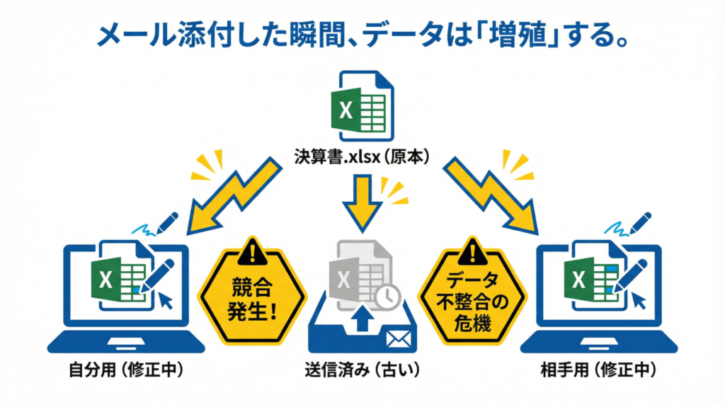 たった1回の送信で、どれが「本当の最新版」なのか、誰にも見えない状態(不可視化)が生まれてしまうのです。