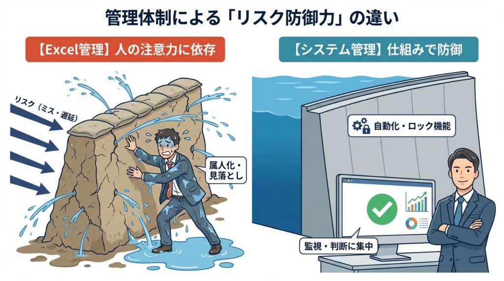 特に「資料回収」は相手の事情に左右されるため、システム化のハードルが高い領域です。ここだけはExcelの柔軟性を残しつつ、絶対に落とせない「期限管理」だけはシステムの強み(アラート機能)で守る。こうしたハイブリッド運用が、現場の混乱を防ぐ鍵となります。
