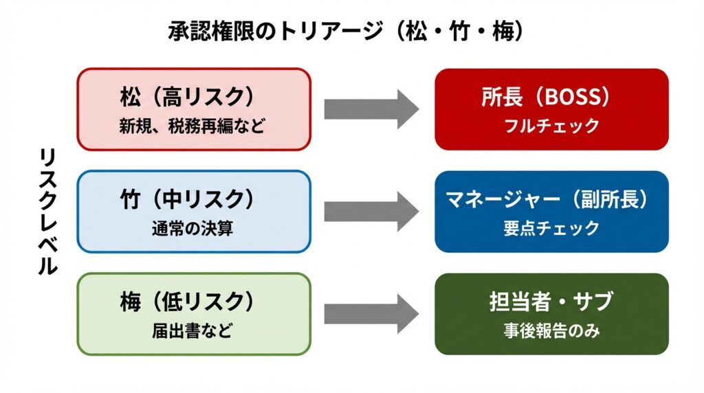 (3)梅(低リスク):定型的な届出書、ゼロ申告など → 担当者+サブレビュアーで完結(所長は全体の最終判断のみ)