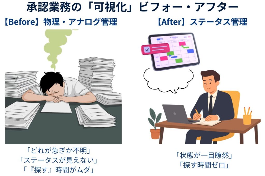 問題の本質は、所長の処理能力ではありません。承認プロセスが、オフィスにいなければできない「場所と時間の制約」に縛られている点にあります。